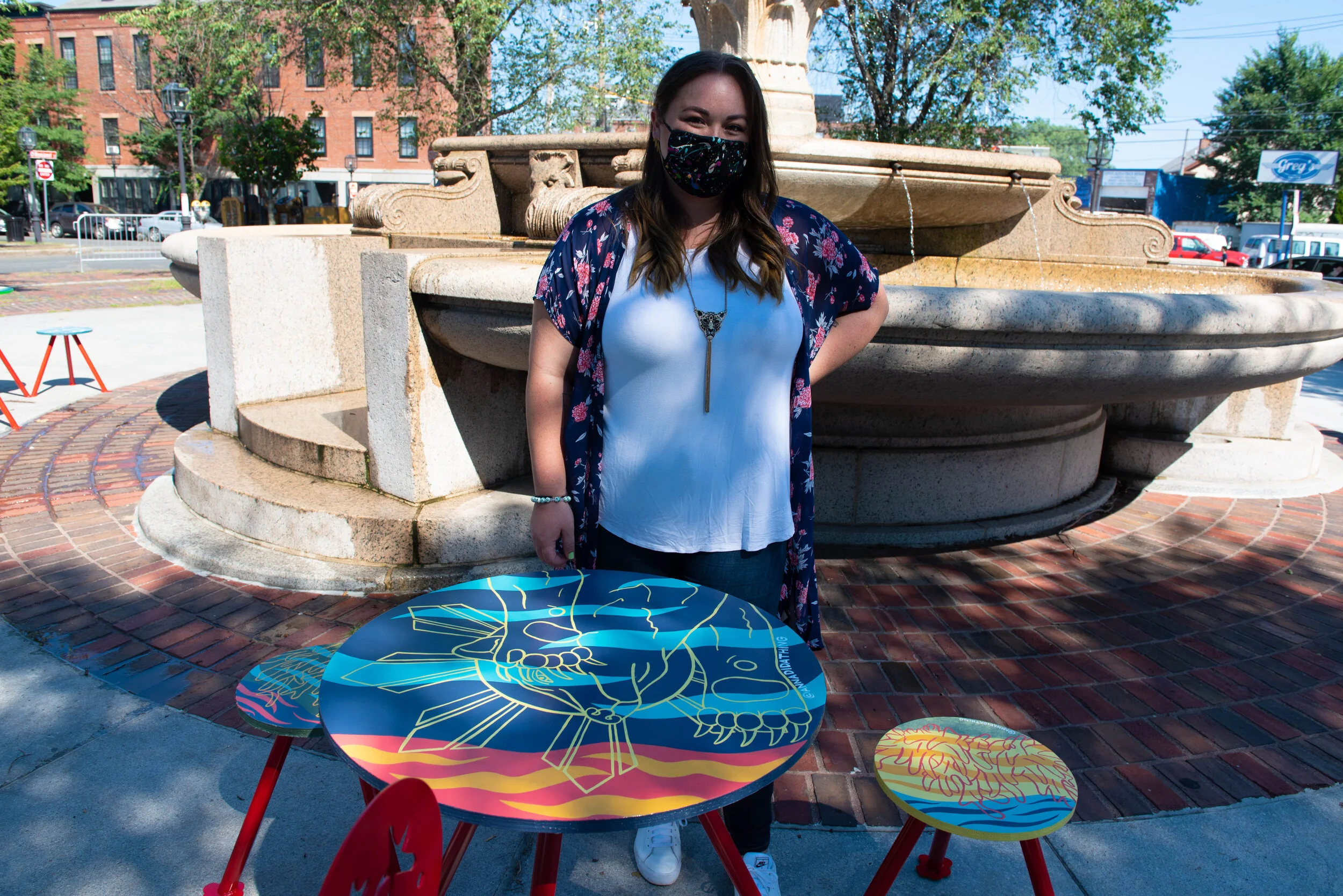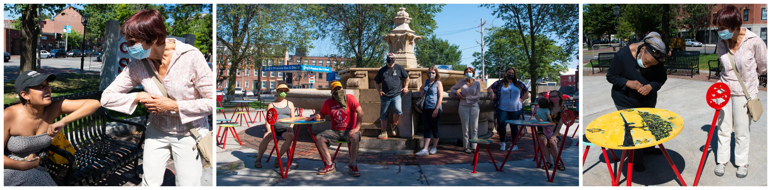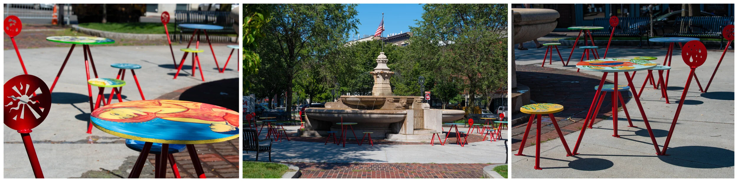 Nuestra Mesa art-tables surround Chelsea Square fountain on installation day, Saturday, August 1, 2020. photo credit: Katy Rogers