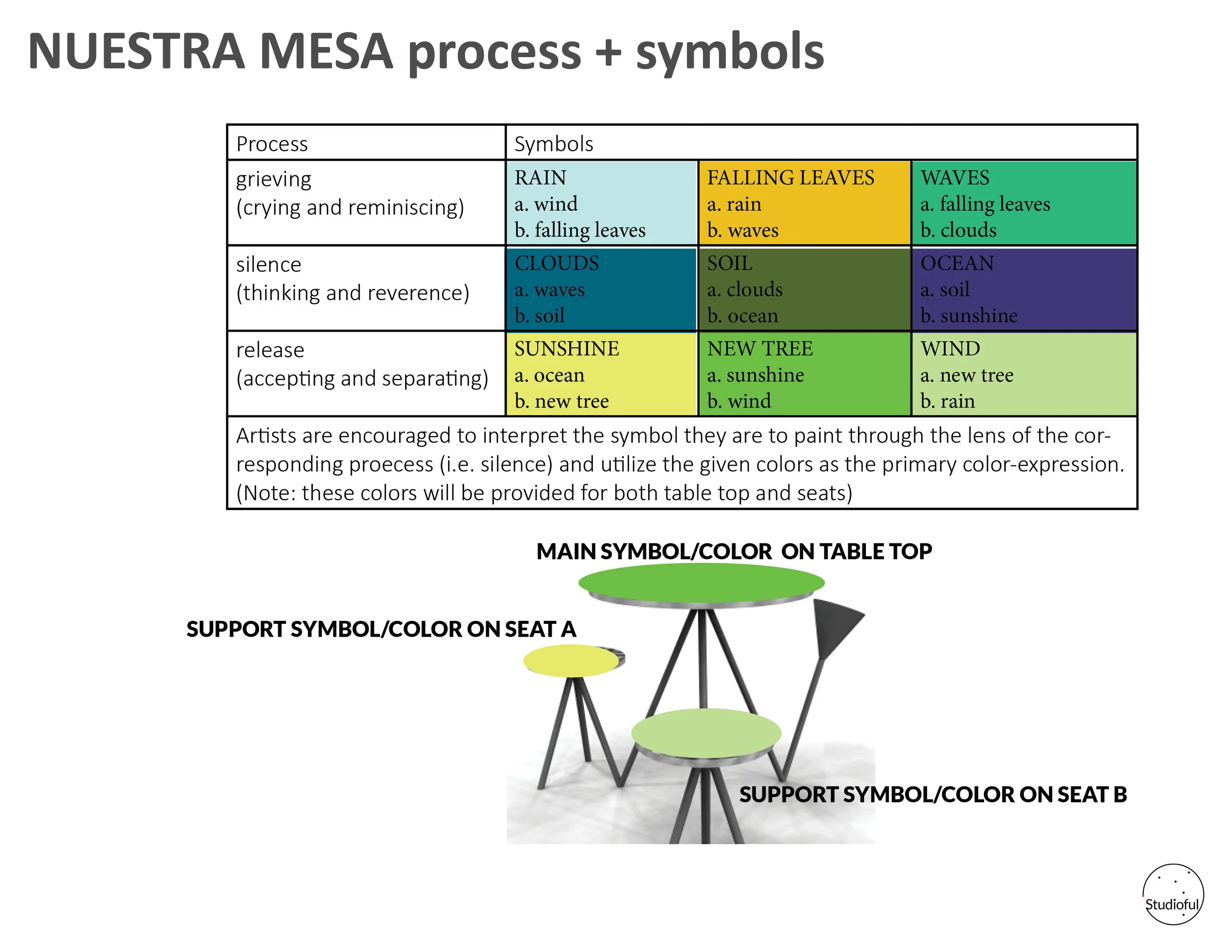 We created a palette of colors and symbols to weave together these themes of mourning across nine tables with two chairs each designed to follow the circular body of Chelsea Square fountain – a place to bring food form a local restaurant and eat, a place to speak with a friend, to enjoy the water’s mist on a hot day, or just to reminisce. We also designed integrated table and chair sets that would showcase these artworks – and be the literal frames for their display. Each table-set includes the distinct symbol from one of the nine days of mourning. We collaborated here with the talented Scott Lanes who made the tables and improved our design in the process.